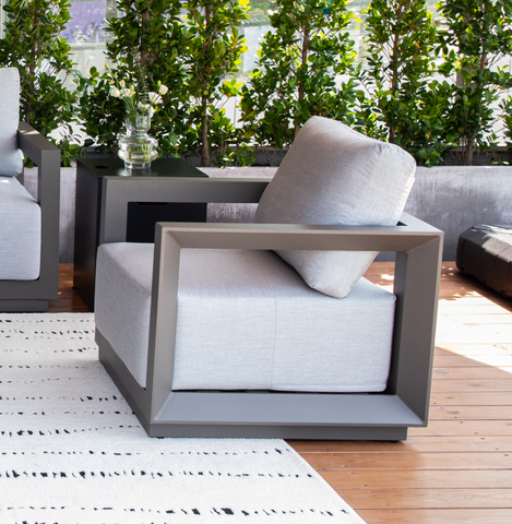 Upholstered in Granite Sunbrella® fabric and filled with high resiliency foam cushions, this chair delivers exceptional comfort and support. Designed to resist water, stains, and fading, the Newport Lounge Chair is the perfect centerpiece for sophisticated outdoor living, capturing the essence of Newport’s laid-back elegance.