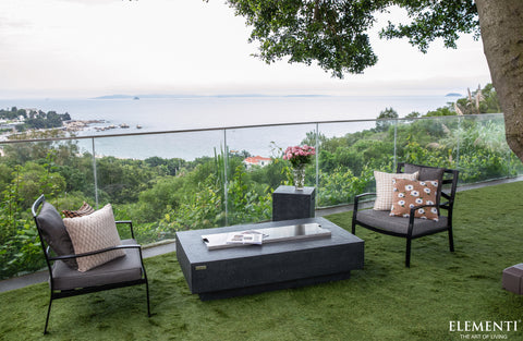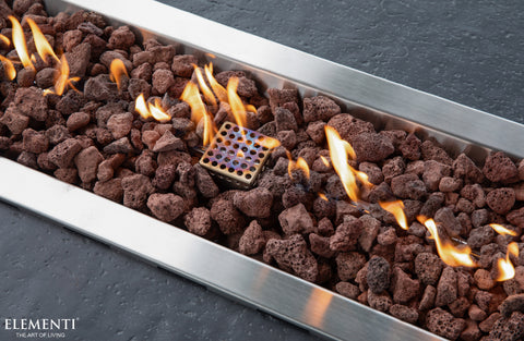 This Elementi Fire Table comes complete with lava rocks and a durable PVC cover for added protection. Accessories such as the glass wind screen, stainless steel burner pan lid, and propane tank cover are available separately.