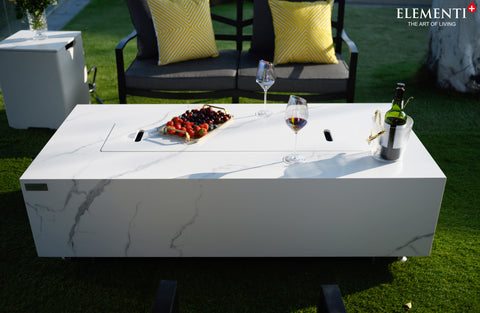 Elevate your outdoor experience with the Carrara Fire Table from the Elementi Plus line. Made from handcrafted GFRC (Glass Fiber Reinforced Concrete) and accented with refined touches of marble and porcelain, this premium fire table brings modern sophistication and lasting durability to any patio or backyard setting.